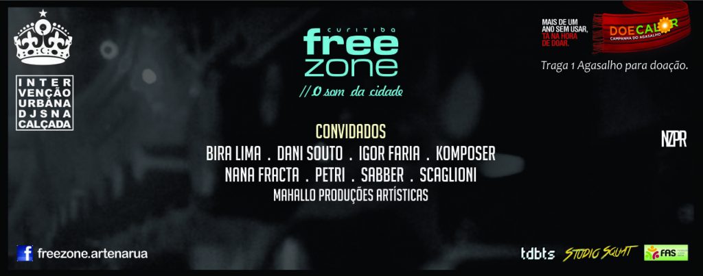 Free Zone” é definida por: DJs na Calçada, Intervenção Urbana”, como diz em sua página. O evento curitibano Mixa diferentes formas de arte no espaço público, unindo a Discotecagem, Artes Gráficas, o Circo e a Fotografia.